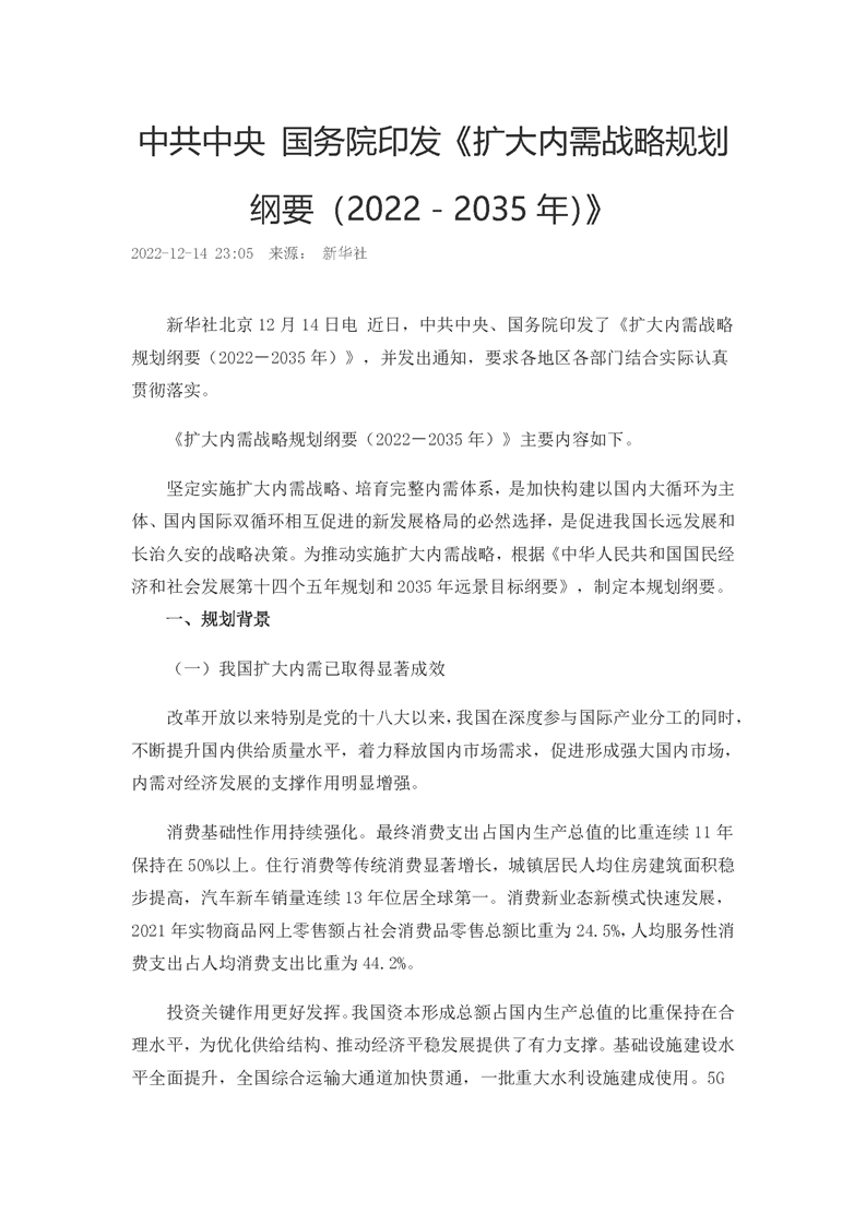 中共中央 国务院印发《扩大内需战略规划纲要(2022-2035年)》